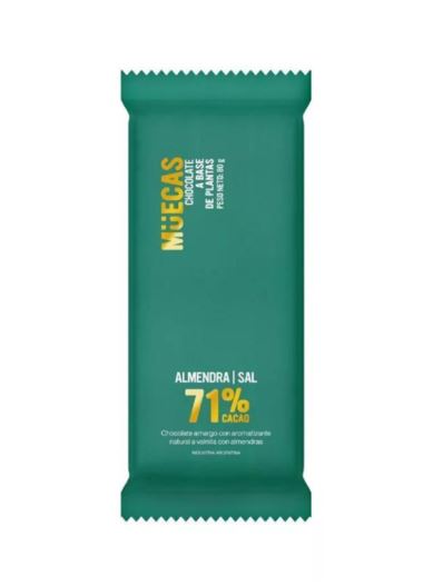 Barra de Chocolate a Base de Plantas con Almendras y sal 71% Cacao x 80g Muecas